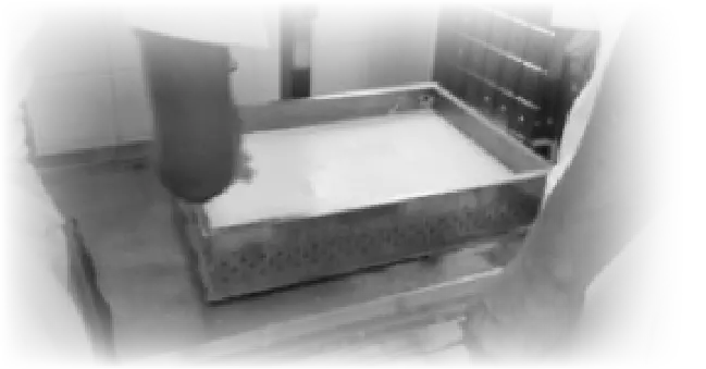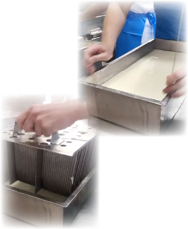 絹ごし豆腐を作る際に豆乳と凝固剤を流し込み、凝固させます。
